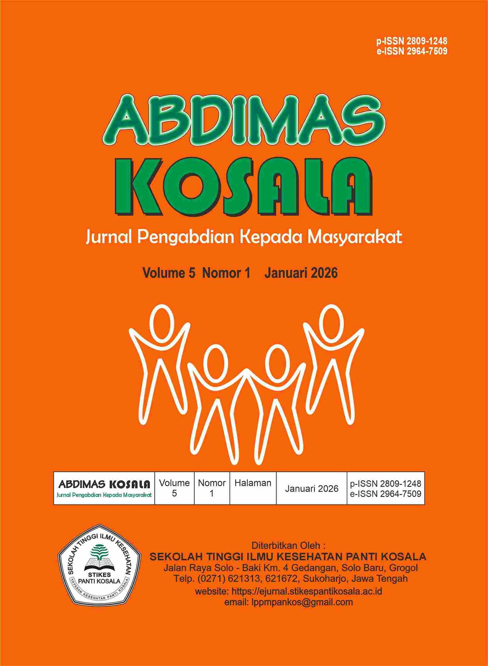 ABDIMAS KOSALA is a community service journal, a national periodical that contains articles related to community service activities. Through this publication, it is hoped that dissemination related to findings, innovations and the application of scientific science and technology in the health sector can be carried out in solving health problems in the community as part of active participation in improving public health status. (See Focus and Scope). STIKES PANTI KOSALA Jalan Raya Solo - Baki Km. 4 Gedangan, Grogol, Sukoharjo, Jawa Tengah. Phone (0271) 6211313 Email: lppmpankos@gmail.com