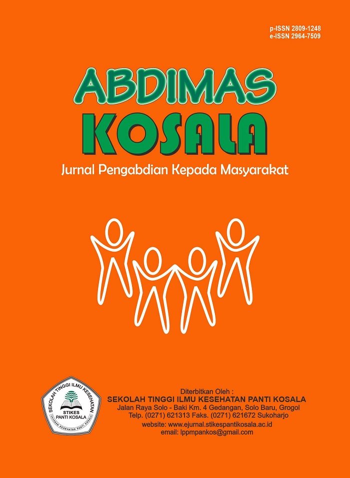 Abdimas Kosala is a community service journal, a national periodical that contains articles related to community service activities. Through this publication, it is hoped that dissemination related to findings, innovations and the application of scientific science and technology in the health sector can be carried out in solving health problems in the community as part of active participation in improving public health status. (See Focus and Scope). STIKES PANTI KOSALA Jalan Raya Solo - Baki Km. 4 Gedangan, Grogol, Sukoharjo, Jawa Tengah. Phone (0271) 6211313 Email: lppmpankos@gmail.com