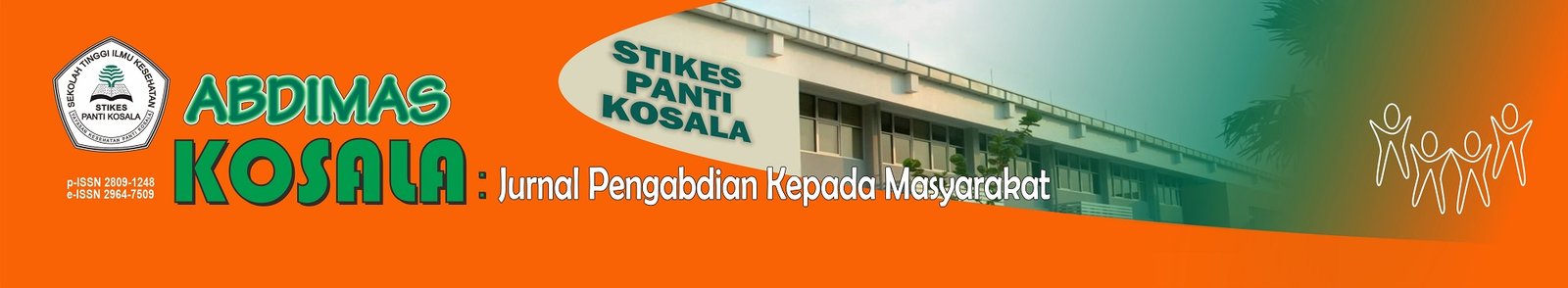 ABDIMAS KOSALA is a community service journal, a national periodical that contains articles related to community service activities. Through this publication, it is hoped that dissemination related to findings, innovations and the application of scientific science and technology in the health sector can be carried out in solving health problems in the community as part of active participation in improving public health status. (See Focus and Scope). STIKES PANTI KOSALA Jalan Raya Solo - Baki Km. 4 Gedangan, Grogol, Sukoharjo, Jawa Tengah. Phone (0271) 6211313 Email: lppmpankos@gmail.com